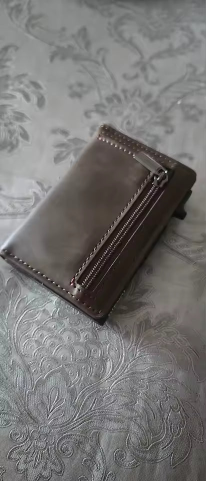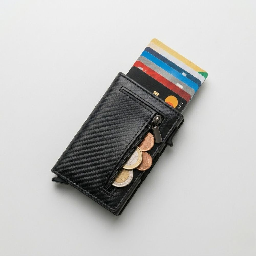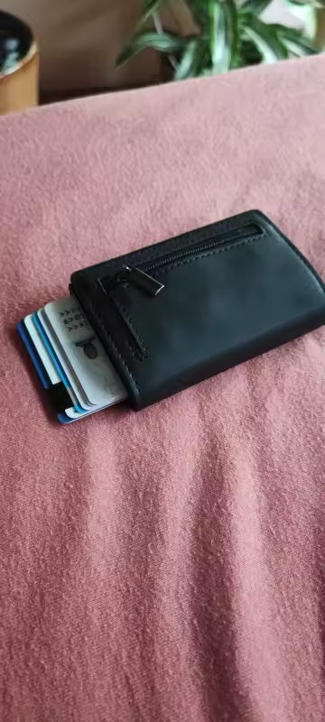Le wallet sécurisé accepte jusqu'à 7 cartes dans le compartiment éjecteur, plus 2 à 4 cartes supplémentaires dans les pochettes latérales, des billets et des pièces dans la pochette zip. Au total jusqu'à 11 emplacements. Compatible avec toutes les cartes standard : CB, permis de conduire, carte vitale, carte de fidélité.