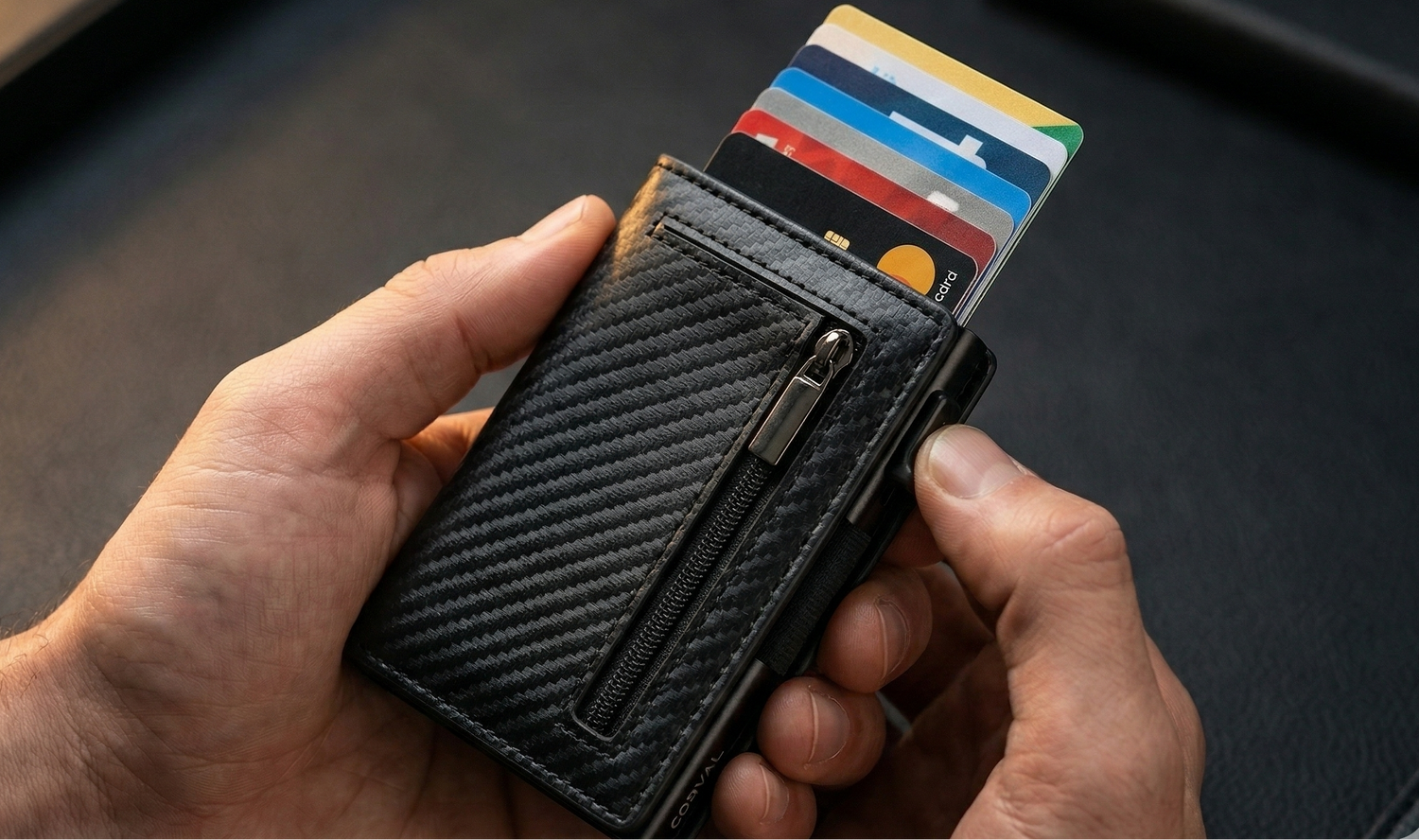 Un seul geste. Vos cartes s'éjectent parfaitement alignées. Votre poche reste plate. Et vos données bancaires sont blindées en permanence — sans y penser, sans rien faire de plus. C'est ça, le VAULTHIN.