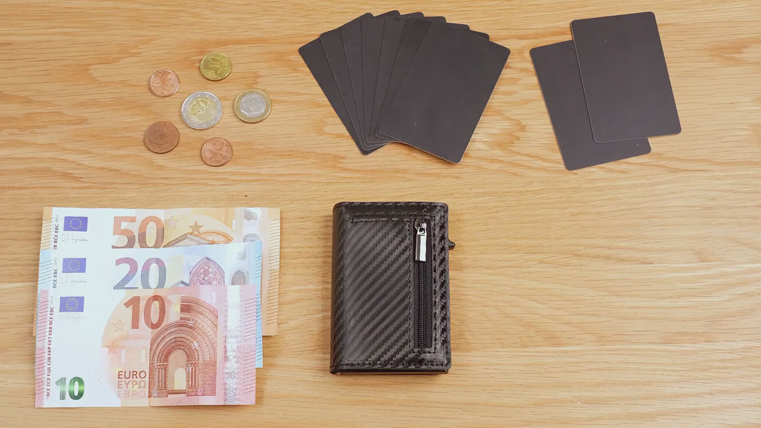 Jusqu'à 11 cartes, billets et pièces. Tout l'essentiel dans un format carte de crédit. Rien de superflu, rien qui manque.